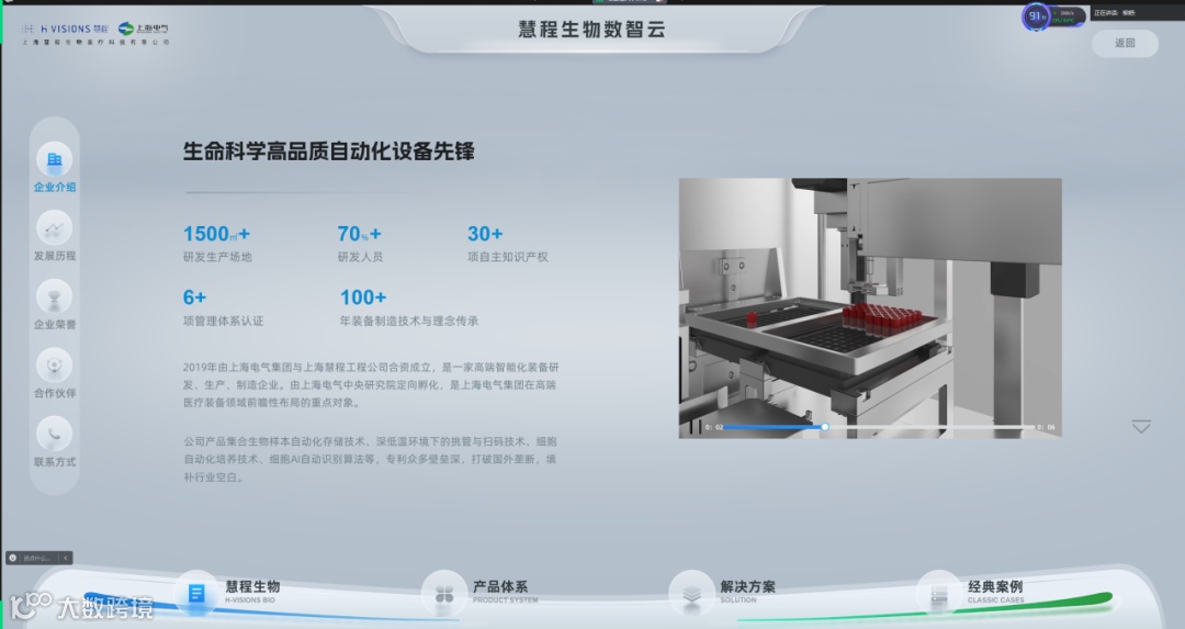 慧程生物联合优秀数字孪生团队,利用数字孪生技术,搭建“慧程生物数智云”数字化展馆,打造沉浸式全自动生物样本库体验馆,使参观者仿佛置身于真实环境中,清晰地展示了慧程生物自动化产品和技术的应用场景,也为现场的客户带来了前所未有的视觉冲击和互动体验。