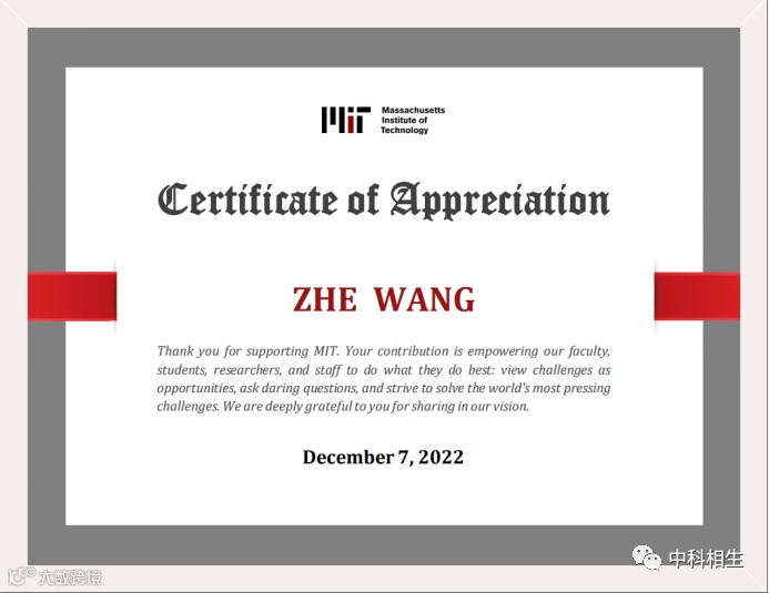 (中科相生创始人王哲先生对MIT前沿科学基金捐赠)