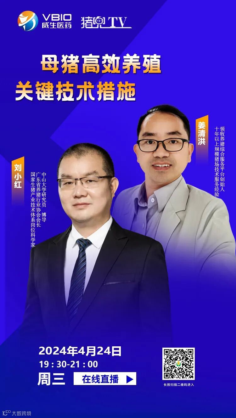 4月24日19:30,威生邀请👉中山大学刘小红教授➕领牧姜清洪分享「母猪高效养殖关键技术措施」敬请期待🌹