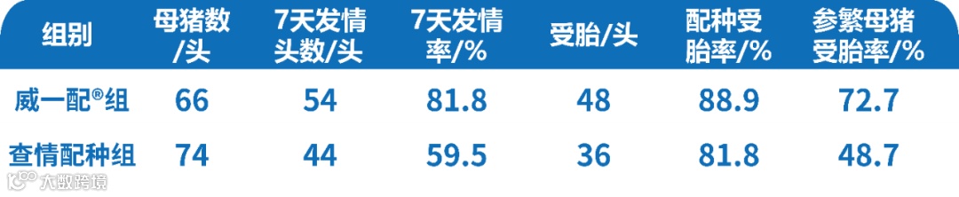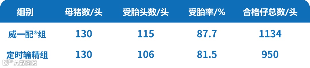 选择后备母猪超过280日龄和断奶超过7天未发情的母猪,根据猪场批次配种计划,按照计划时间点开始饲喂烯丙孕素,然后分别使用威一配方案和常规定时配种方案(上述方案中第20天注射常规PMSG,第23天注射GnRH,在第24天和第25天共进行2次定时输精,且需要查情)。与常规定时配种组比较,威一配组提高受胎率6.15%,合格仔猪总数多184头,平均合格仔数提高1.41头。