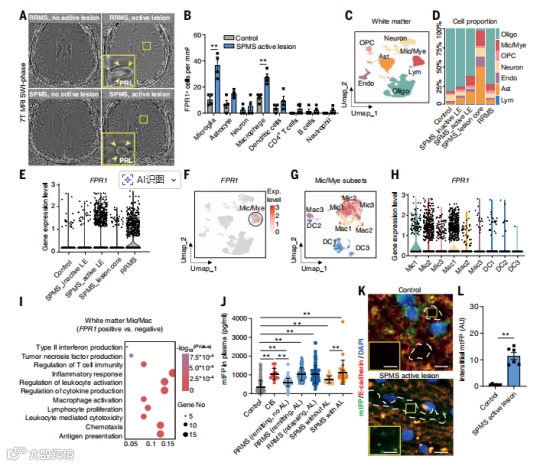 MS 患者活动性病灶中,中枢神经系统驻留的小胶质细胞和浸润巨噬细胞显著高表达 FPR1,而健康人群中该受体表达极低;