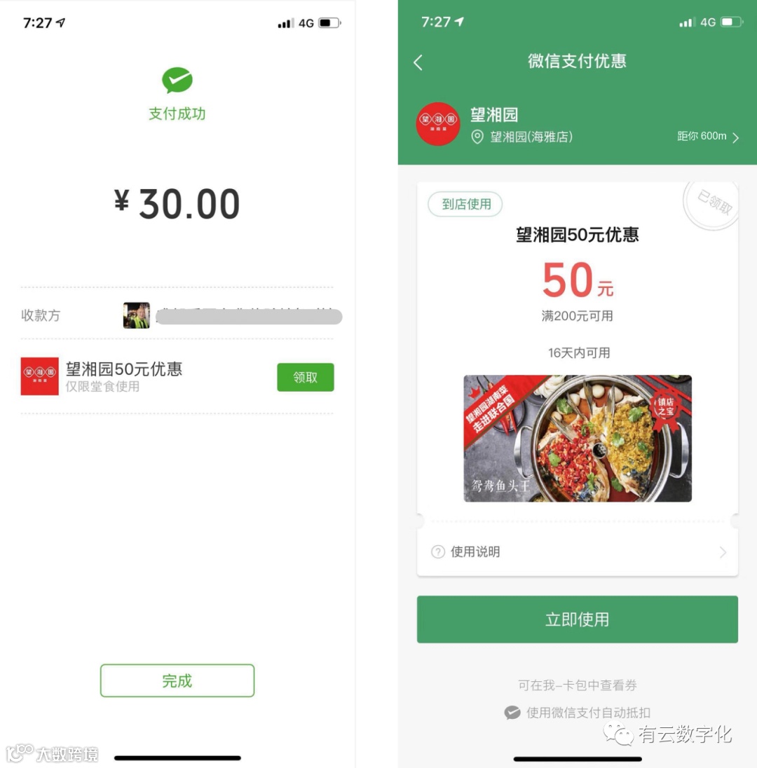 消费者领取卡包之后,可以在下次使用的时候用微信付款,达到满减要求会自动扣减核销,达到营销目的。