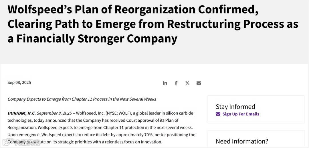 9月8日,Wolfspeed重组计划已获得法院批准,预计将在能够在未来数周内完成重整程序。
