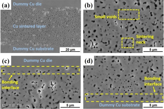 (3) 采用惰性气氛避免烧结氛围内氧气的影响,但无法去除铜膏中已经存在的氧化,且气体纯度难以保证。采用还原性气氛进行烧结,甲酸气氛作用下烧结温度低、还原效果好[1],但甲酸本身具有一定的腐蚀性,对烧结设备要求较高。