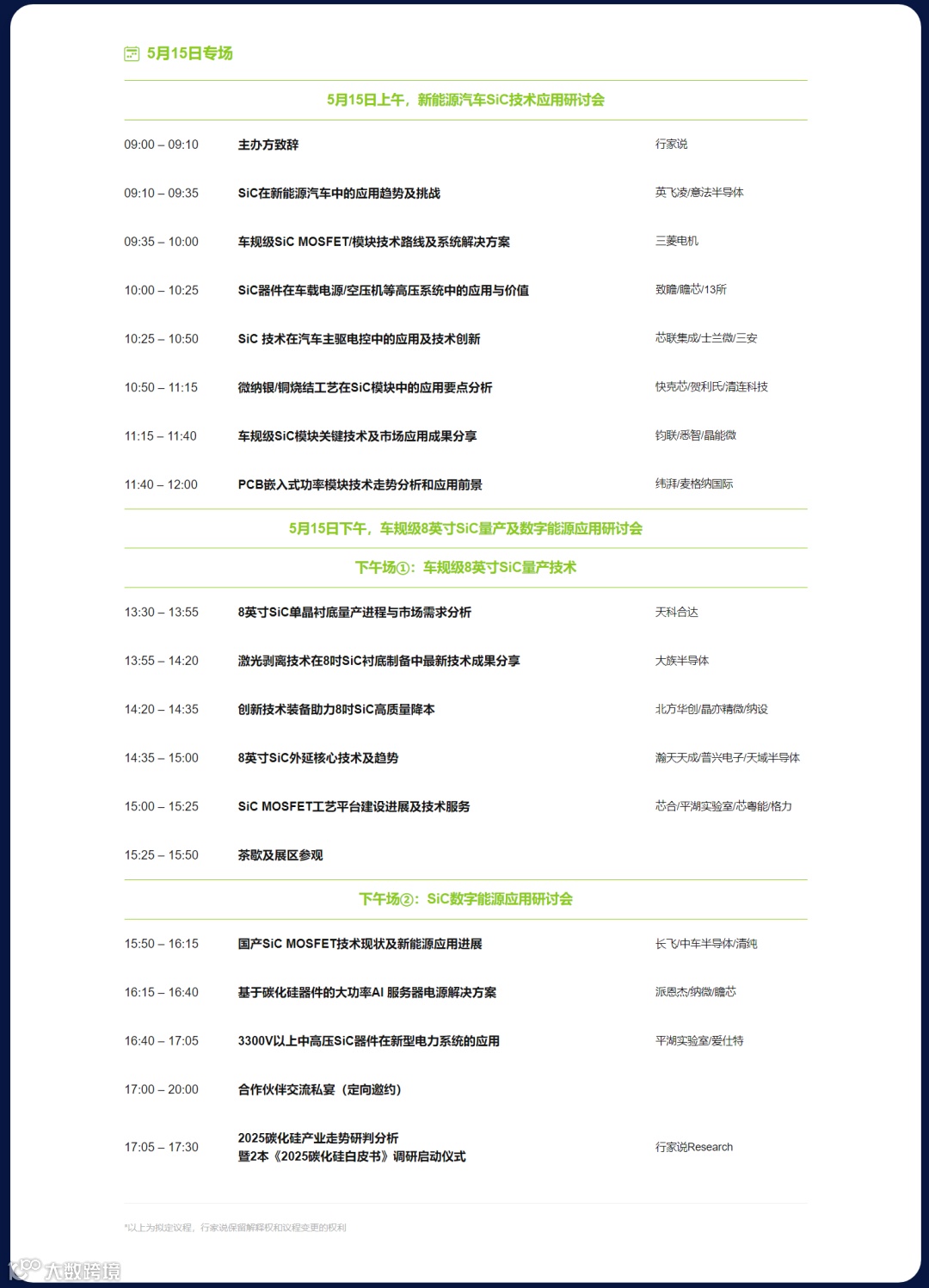 值此关键时刻,聚焦8英寸碳化硅量产技术,围绕新能源汽车等主流应用市场,“行家说三代半”将举办“2025年车规级8英寸SiC量产技术及汽车&数字能源应用大会”,通过打造3场专题论坛和1场专场展览,为碳化硅产业链提供一个深度对话与分享的平台。