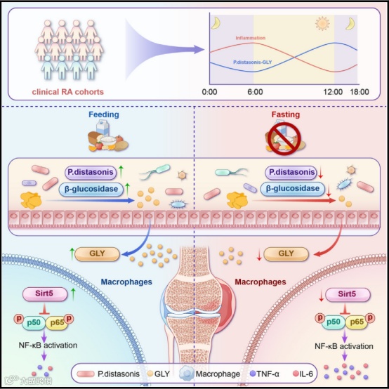 Ma 等人证明,饮食时间通过诱导肠道微生物群的昼夜振荡来调节RA的炎症节律。具体而言,研究发现副拟杆菌(P. distasonis)利用β-葡萄糖苷酶(β-GC)从饮食中释放甘草黄素(GLY)以响应每日营养提示,从而影响依赖于 sirtuin 5-核因子-κB(SIRT5-NF-κB)轴的 RA 炎症节律。值得注意的是,研究通过昼夜循环中的连续采样验证了RA患者中P. distasonis-β-GC-GLY的每日波动。这些发现强调了饮食时间在RA节律中的关键作用,并为缓解关节炎的新治疗策略提出了潜在的临床意义。