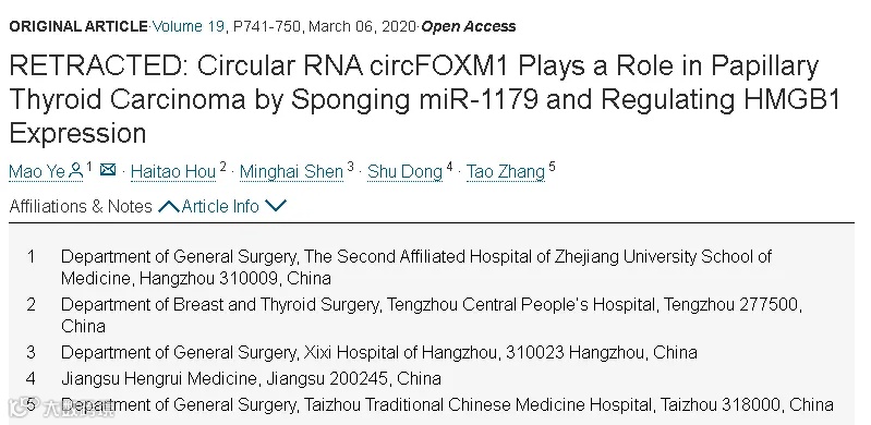2020年3月,第一作者兼通讯作者:浙江大学医学院附属第二医院的Mao Ye在Molecular Therapy — Nucleic Acids(IF6.5005 / 2区)期刊上在线发表题为“Circular RNA circFOXM1 Plays a Role in Papillary Thyroid Carcinoma by Sponging miR-1179 and Regulating HMGB1 Expression”(环状RNA circFOXM1通过海绵miR-1179调控HMGB1表达在甲状腺乳头状癌中发挥作用)的论文遭撤稿。
