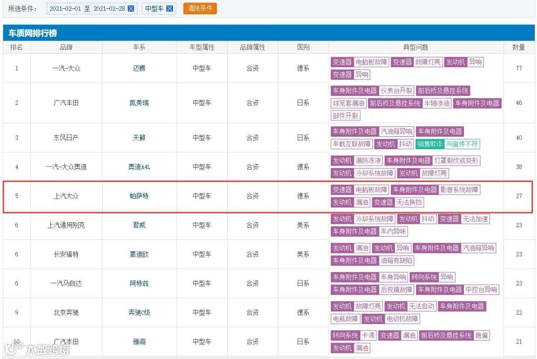 事实上,在车型投诉榜单上,帕萨特也是榜单上的常客。车质网数据显示,2021年2月份,帕萨特因为质量问题较多,位居中型车投诉榜单第5名。
