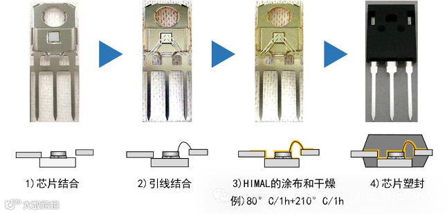 其中,“HIMAL”作为塑封料的底漆进行涂布,可提高引线框架、元件、引线与塑封料之间的接着力,还缓和应力,兼顾塑封料的耐热性并抑制分层,从而提高功率半导体的可靠性,已经广泛应用于SiC功率模块中。