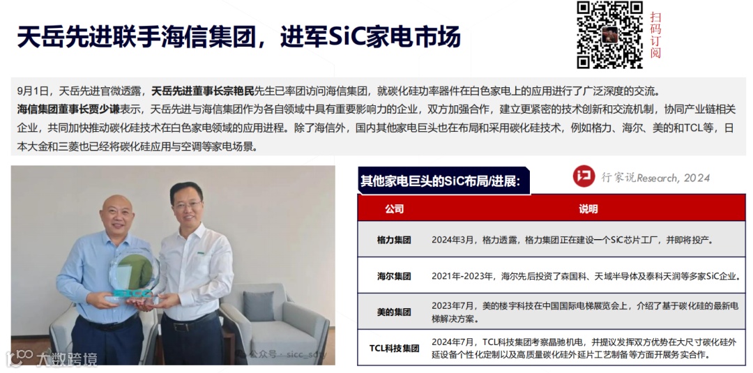 据行家说产研中心《季度内参——第三代半导体与新能源汽车(2024Q3)》汇整,除格力外,海信集团、海尔集团、美的集团及TCL科技集团等家电巨头均有相关SiC布局/进展: