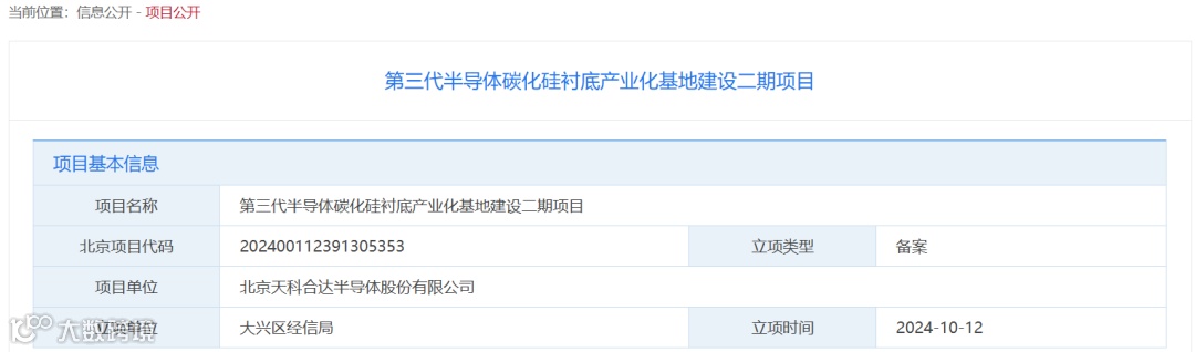 10月12日,据“北京市生态环境局”披露,北京天科合达半导体股份有限公司的SiC衬底产业化基地二期项目已完成备案,环评审批现已公示。
