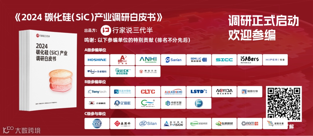 插播:合盛新材料、芯聚能、安海半导体、三安半导体、烁科晶体、天岳先进、青禾晶元、恒普技术、华卓精科、快克芯装备、泰坦未来、东尼电子、科友半导体、长联半导体、瑶芯微、致领半导体、奥亿达新材料、瑞霏光电、才道精密、亿值旺、纯水一号、中科光智、成都炭材、中电化合物、森国科、士兰微、清软微视、清连科技、弘信新材、高泰新材、创锐光谱等已正式参编《2024碳化硅(SiC)产业调研白皮书》,详情请点文章底部“阅读原文”。