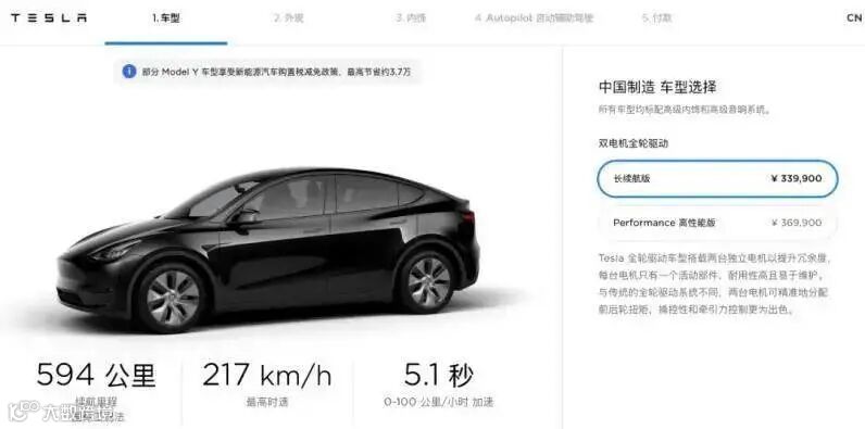 部分Model Y 车型享受新能源汽车购置税减免政策,最高节省约3.7万,起售价为预估节省后的实际价格,并且预计将于2021年1月开始交付。