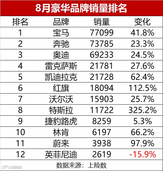 从最新公布的8月份豪华品牌销量排名来看,一线BBA地位稳固,宝马夺得当月销量冠军;二线变化较大,自主豪华品牌“红旗”销量大涨,并超越沃尔沃挤进二线前三位置;同时国产Model 3销量持大幅上涨,特斯拉排名也上升较快。