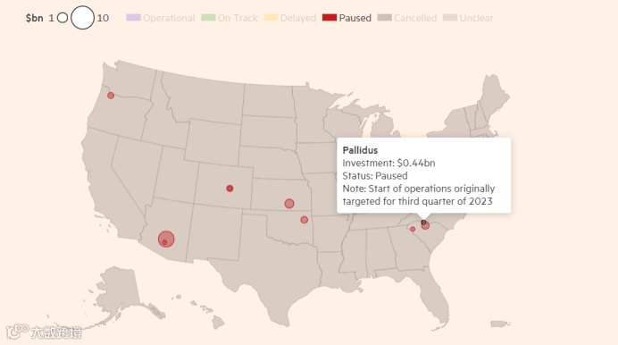 8月12日,据英国《金融时报》报道,他们通过1年的追踪调查发现,在美国《通胀削减法案》和《芯片与科学法案》支持下的114个大型项目,约有40%已被推迟或暂停;而这当中也包括数个SiC相关项目,建设方包括Microchip、Pallidus及Entegris。