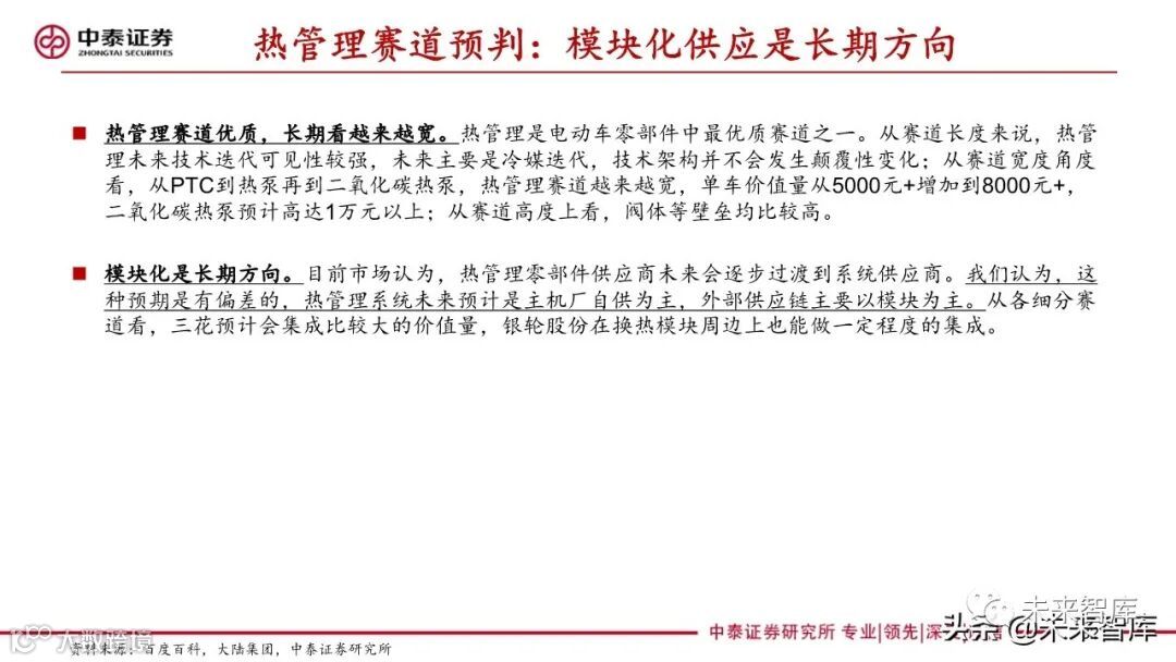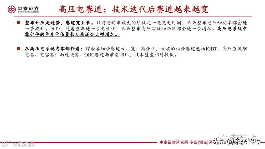 (3)热管理和高压电系统是确定性最强的赛道。热管理和高压电赛道的特点是几乎没有技术迭代风险 ,在高压化趋势下,赛道的宽度也会增加、竞争壁垒越来越高;