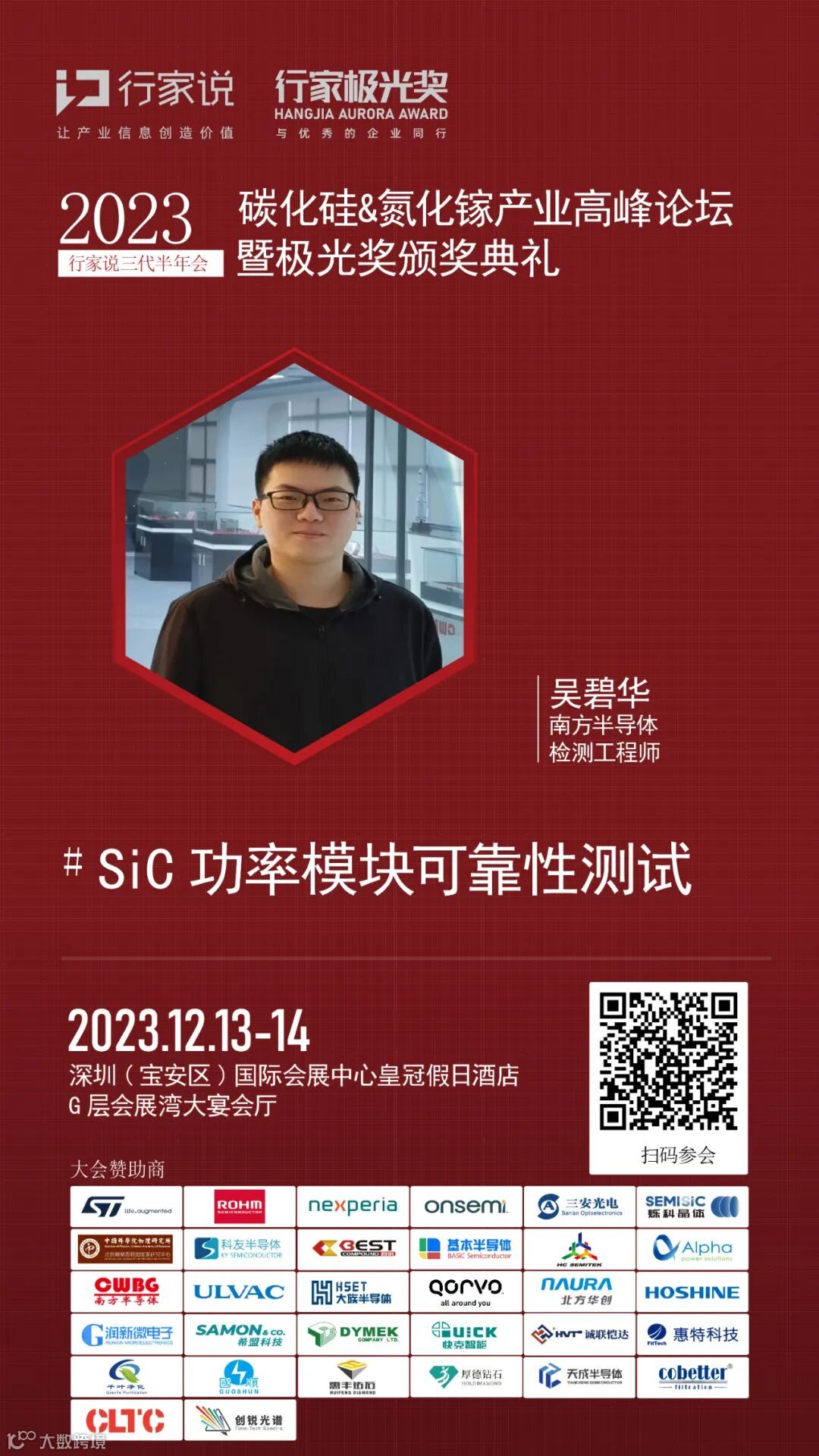 12月13-14日,由行家说举办的三代半年会“2023碳化硅&氮化镓产业高峰论坛暨极光奖颁奖典礼“将在深圳举办,南方半导体已确认参会。届时,南方半导体检测工程师吴碧华将带来《SiC功率模块可靠性测试》的主题报告。