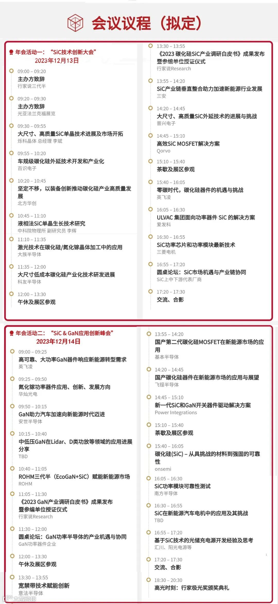 本届年会将设置2场技术论坛、2天专场展览及1场颁奖盛典等,预计2天活动将有近1000名来自应用终端企业、碳化硅和氮化镓主供应链企业、关键耗材和设备企业的专业人士出席,共同探讨行业未来发展趋势。