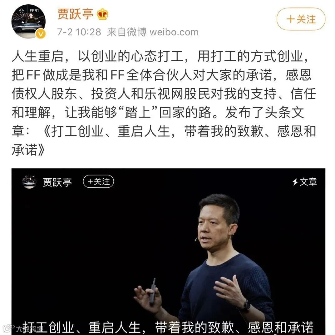 中工汽车网讯:7月2日10点左右,贾跃亭微博发布长文:打工创业、重启人生,带着我的致歉、感恩和承诺。