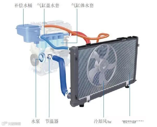 发动机冷却系统有水冷和风冷之分,汽车发动机多采用水冷却系统。水冷却系统以水为冷却介质,它主要由散热器、水泵、节温器、冷却风扇、补偿水桶、发动机机体和气缸盖水套以及其他附属装置等组成。