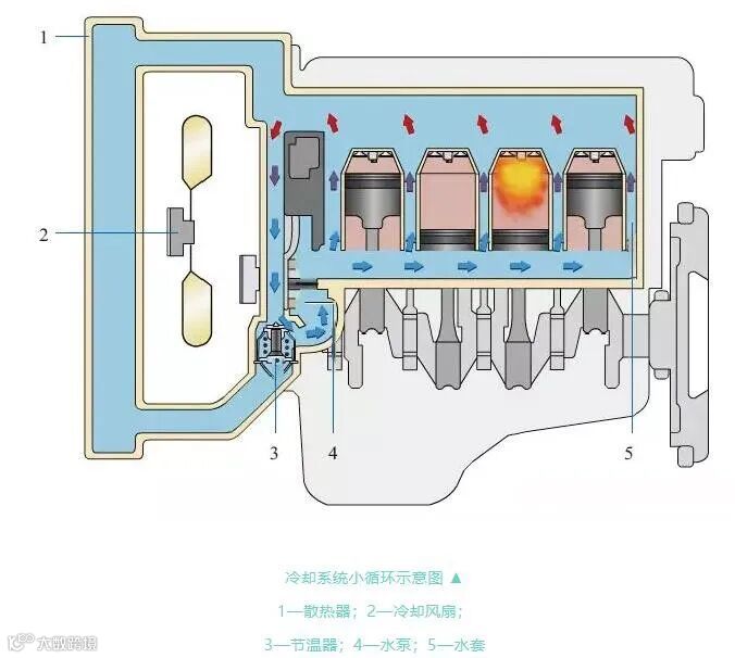 所谓小循环,就是当冷却水或冷却液温度低于规定值(一般为80℃左右)时,受节温器控制,循环的水或冷却液不经过散热器。即水或冷却液从缸盖水套流出,经节温器直接进入水泵进水口,再由水泵送入缸体和缸盖的水套。由于水或冷却液不经过散热器,可使发动机温度迅速升高。