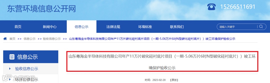 “行家说三代半”发现,2月20日,东营环境信息公开网对外公示了山东粤海金半导体科技有限公司年产11万片碳化硅衬底项目的竣工环境保护验收。