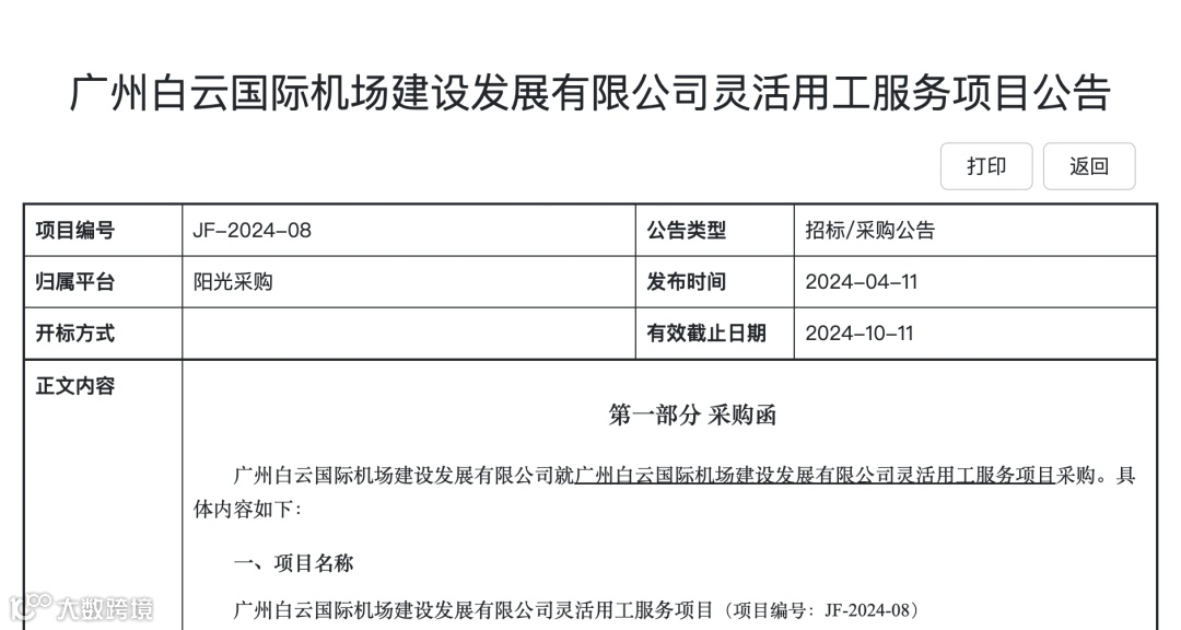 4月11日,广州白云国际机场建设发展有限公司发布了一则灵活用工相关的招标,项目名称是“广州白云国际机场建设发展有限公司灵活用工服务项目”,以下为招标公告全文,详情请点击文章左下角“阅读全文”。