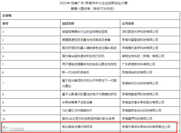 6月29日,珠海市工业和信息化局公布了2023年“创客广东”珠海市中小企业创新创业大赛初赛评审结果,其中入围的包括一个GaN项目。