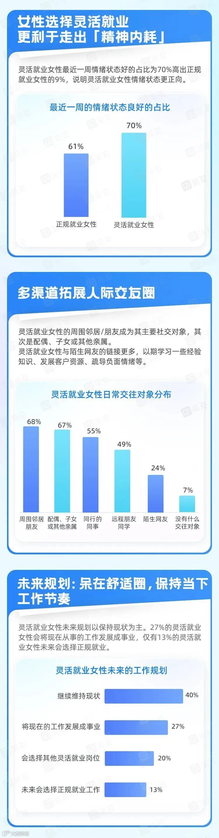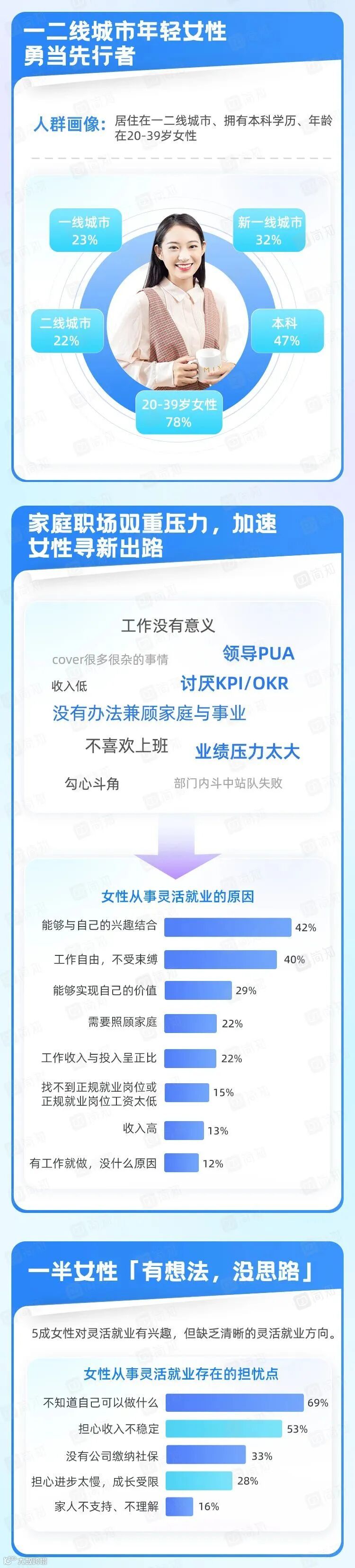 时代机遇之下,数字技术和平台经济快速发展,为灵活就业提供了便利。灵活就业成为了女性实现自我价值的另一种方式,面对未知的挑战,唯有及时更新自我,才能稳步跟上外界步伐。