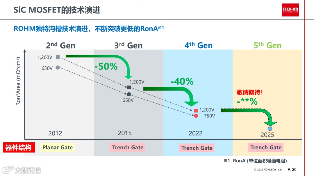 此外,罗姆半导体的沟槽栅SiC MOSFET技术也在继续不断精进,帮助客户降本增效。截至目前,罗姆已经量产了第4代SiC MOSFET,相比第三代产品,其RonA下降了40%左右。预计2025年,罗姆将推出第五代SiC MOSFET,RonA将在第四代的基础上实现进一步的下降。