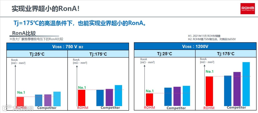 罗姆半导体第4代SiC MOSFET中,罗姆通过进一步改进了他们自有的双沟槽结构,实现了业界超低的导通电阻,甚至在Tj=175℃的高温条件下,也能实现业界超小的RonA,并在RonA降低的同时,保持较长的短路耐受时间。