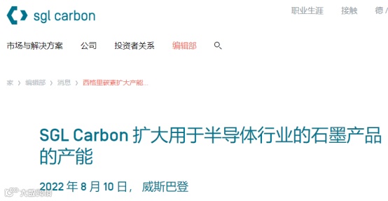 8月10日,西格里碳素官网发布消息称,他们将投资数百万欧元(至少超过1400万元人民币)用于半导体行业的石墨产品的产能扩展,计划将在未来2年内分以下步骤进行: