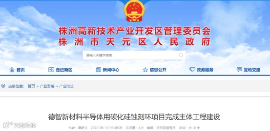 6月10日,据“株洲市天元区人民政府”官网报道,湖南德智新材料有限公司半导体用碳化硅蚀刻环项目完成了主体工程建设,并预计在2023年初投产。