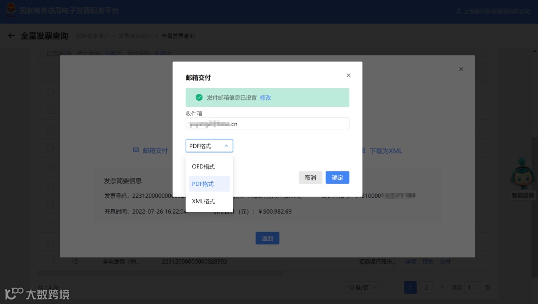 2.点击【邮箱交付】,页面上会弹出“邮箱交付”页面,如图 2所示。录入电子邮箱后可以选择文件格式,文件的格式有OFD、PDF和XML三种;选择一种文件格式,点击【确定】,发票交付到录入的邮箱中。