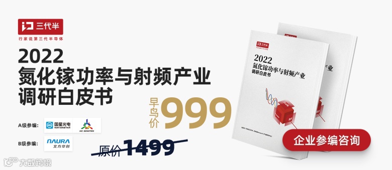 获取更多中国乃至全球的氮化镓产业资讯,可关注《2022氮化镓功率与射频产业调研白皮书》。目前《白皮书》已开放预定,现在预定可享受早鸟价999元,优惠结束后将恢复原价1499元,详情点文末“阅读原文”。