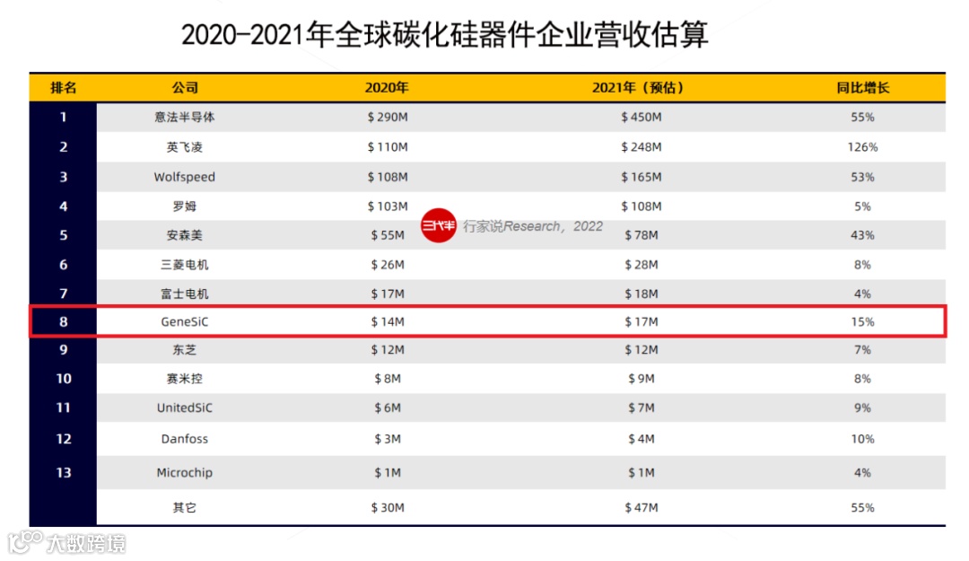 公开资料显示,GeneSiC成立于2004年,2021年碳化硅功率器件营收全球排名第八,主要提供650V~6500V全系列车规级碳化硅MOS,产品主要由X-Fab代工,已经在全球知名电动汽车品牌大量出货。
