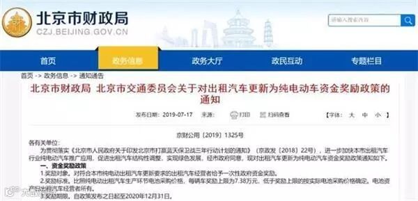 通知指出,对符合北京市纯电动出租汽车更新要求的出租汽车经营者给予一次性政府资金奖励,比照纯电动出租汽车生产环节电池采购价格,每辆车奖励上限为7.38万元,低于奖励上限的按实际电池采购价格确定,电池资产归出租汽车经营者所有。奖励期限自政策发布之日起至2020年12月31日结束。