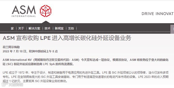 7月18日,荷兰半导体设备制造商 ASM International 宣布收购意大利 SiC 外延设备制造商 LPE。