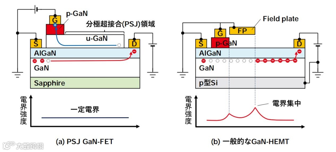 2DEG可以实现高速开关操作,而2DHG可以实现高耐压,从而解决了以往HEMT结构会产生电场集中的难题。