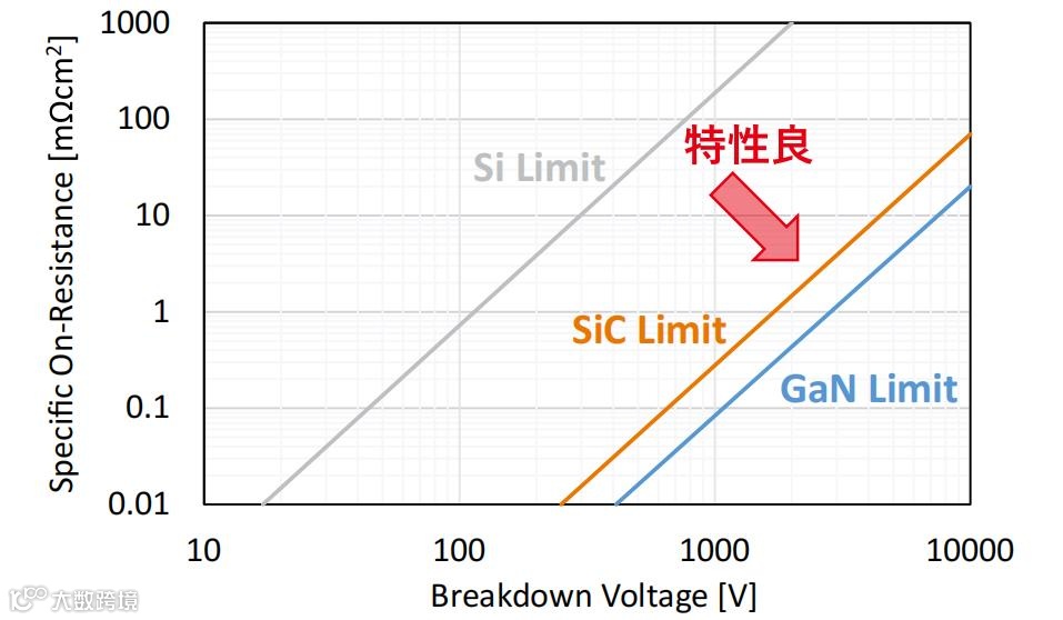 理论上,在相同耐压情况下,SiC的导通电阻极限值优于硅,而GaN优于SiC。SiC和GaN都是高耐压、低导通电阻器件的绝佳材料。