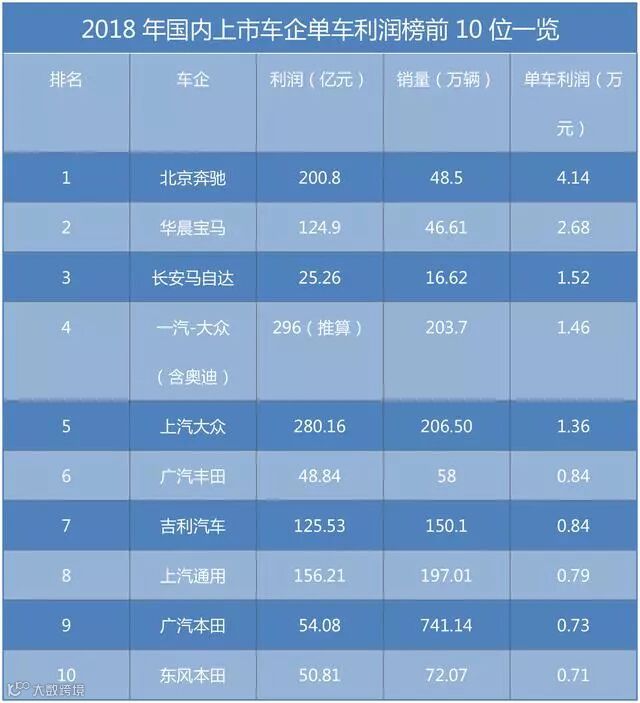 从计算结果来看,2018年单车利润最高的品牌是北京奔驰,2018年北京奔驰的销量接近49万台,利润超过200亿,所以单车利润达到4.14万,相当于一辆夏利的车价,这比2017年的奔驰全球平均约合3.5万的单车利润还要高,这是奔驰品牌在中国市场价值的体现,但是也在一定程度上滋生了奔驰在中国市场的傲娇,奔驰最近两年在中国产品被频繁投诉不说,和经销商一道,对消费者利益的漠视我们也见证了不少,其实西安女硕士在奔驰利之星的遭遇只是一个缩影,本质最近几年在中国的市场渠道中,比这恶劣的情况多得多!其实有一个很大的原因就在于,销量一直优秀,而且单车利润很高,因此才有了傲娇和漠视中国消费者的底气。