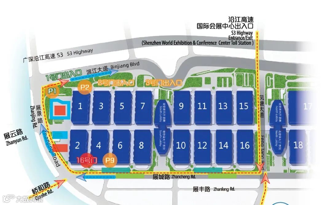 建议从P1 / P5停车场入口进入,停放在展馆F区域(距离11号馆路线最短)。