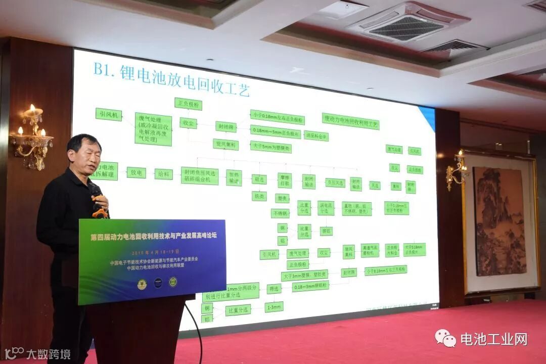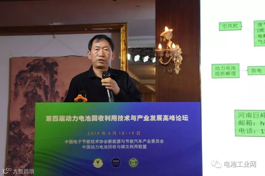 2019年4月18日上午,第四届动力电池梯次利用大会在万众瞩目中隆重举行!中国电子节能技术协会常务副理事长张恩惠、前工信部节能与综合利用司副巡视员黄建忠、工信部节能司王文远处长等领导出席大会,电池回收及梯次利用相关企业共300多人共同参加本次活动,见证行业盛典!其中,河南巨峰环保科技有限公司董事长巨峰先生在第四届动力电池回收利用技术大会上做了:“废锂电池回收处理新型工艺技术与装备”报告。