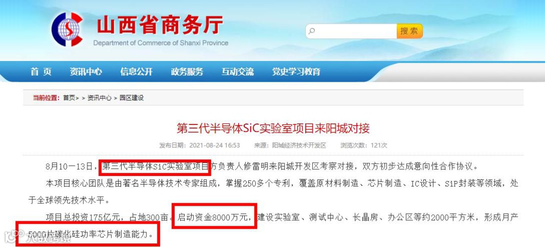 据山西省商务厅网站公告,8月10日至13日,第三代半导体SiC实验室项目与阳城开发区负责人达成合作协议,将建设SiC实验室等产业基地,总投资175亿元。