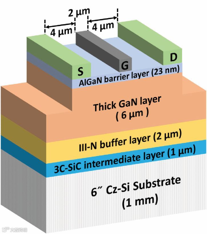 该结构是这样的:首先,采用廉价的硅衬底;其次,使用独特的成膜技术,在硅衬底上生长高质量的3C-SiC薄膜;然后,在SiC薄膜上依次生长2 µm的含铝III-N缓冲层、6µm的GaN层,和23 nm 的AlGaN势垒层。