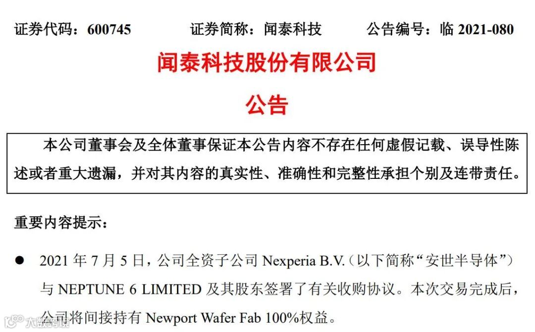 7月5日晚,闻泰科技也确认了该交易。根据公告,安世半导体收购了NWF母公司NEPTUNE 6 LIMITED 100%股权,因此持有NWF 100%权益。