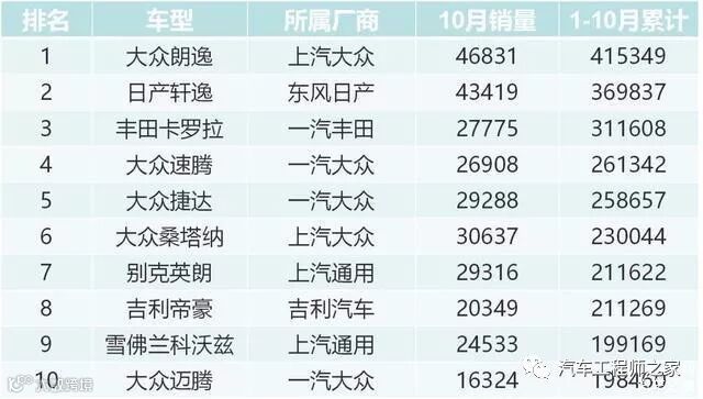 今年1-10月份的轿车累计销量排行表已经出来了,毫无意外的话,大众将成为最大赢家。大众朗逸首当其冲排在第一位,日产轩逸、丰田卡罗拉也紧追其后。销量前三,出乎你的意料吗?