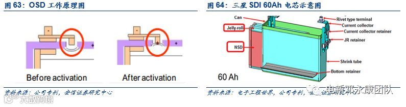 过充安全保护装置(OSD,Overcharge Safety Device):目前这个安全设计在很多电池上都能看到。一般是一个金属薄片,配合fuse使用,fuse可以设计到正极集流体上,过充时电池内部产生的压力使得OSD触发内部短路,产生瞬间大电流,从而使Fuse熔断,从而切断电池内部电流回路。