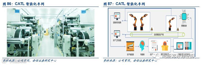 CATL制造智能化,人机互动性强。目前,CATL投资数十亿元建立智能化、自动化产线,该产线在“智慧工厂”和工业4.0信息物理融合系统CPS的指导下,实现了高度的自动化。厂区内使用了大量的高科技机器人、中控系统、在线检测设备和信息追溯系统,以做到“生产数据可视化”、“生产过程透明化”、“生产现场无人化”。而且CATL根据离散型制造的特点,将其组织结构设计、经营管理流程、生产制造、仓储物流设计、产线设备自动化都采用系统化管理。所建成的智能化车间,具有较强的技术成果可复制性和可扩展性。