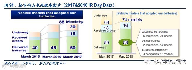 除了和特斯拉的深度合作外,松下为了扩展业务同样寻求了更多的其它合作伙伴。截止2018年3月底,松下已供货车型/已取得订单车型/在洽谈车型分别为58款/16款/74款,客户遍布日本、美国、欧洲,其中已供货日本/美国/欧洲分别为6家/2家/4家车企,日本有29款车型交付、美国有14款车型交付、欧洲有15款车型交付。